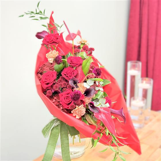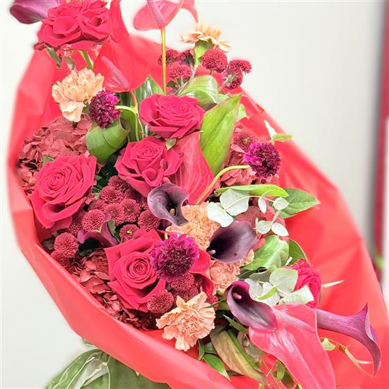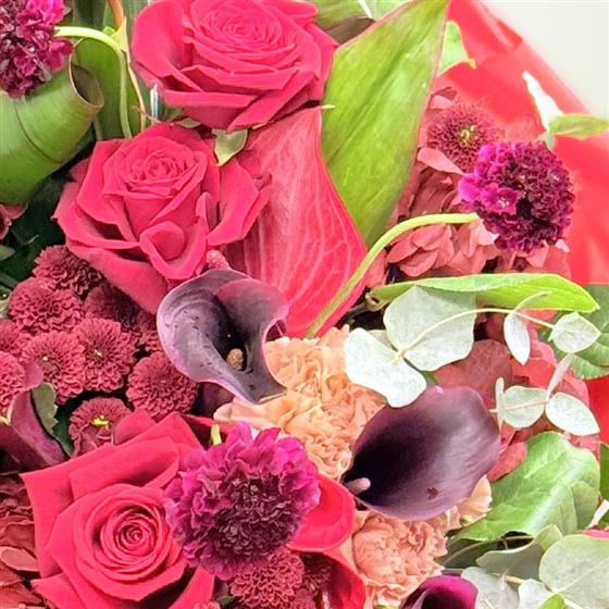 The palette is a moody and romantic blend of deep crimsons, velvety burgundies, and soft, sunset peaches. We have combined iconic Red Roses and sleek Burgundy Calla Lilies with the architectural gloss of Anthuriums. To add softness and depth, we’ve woven in ruffly Peach Carnations and cloud-like Hydrangeas, while the delicate, dancing heads of Scabiosa provide a whimsical, "just-picked" feel.