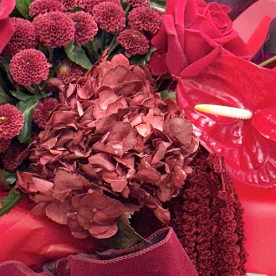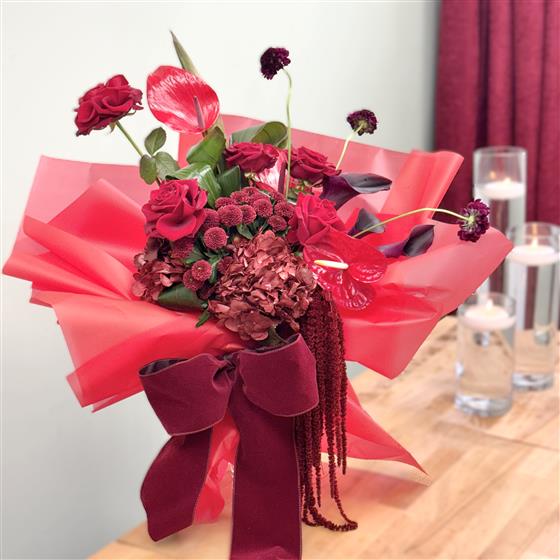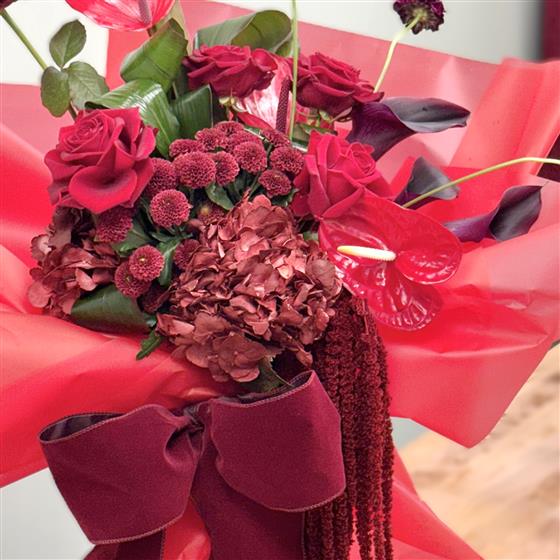 We’ve paired these iconic roses with a curated selection of exotic and textural stems. Glossy, heart-shaped Anthuriums and sleek Calla Lilies provide a modern, sculptural edge, while the soft clouds of Hydrangea and the delicate, dancing heads of Scabiosa add layers of sophisticated detail. To create that "rebel" silhouette, we’ve included cascading Amaranthus and a selection of seasonal luxury foliages for a wild yet refined finish.