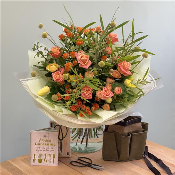 This perfect gift bundle includes an artisan bouquet, gardening inspiration book, utility belt and scissors.
