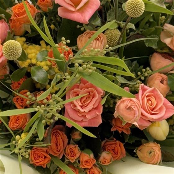 This delightful handtied bouquet features tones of Peach, Pink, orange & lemon. We have created this bouquet of roses, spray roses, tulips and elegant soft foliages to create a timeless classic full of elegant colours, textures and playfulness.