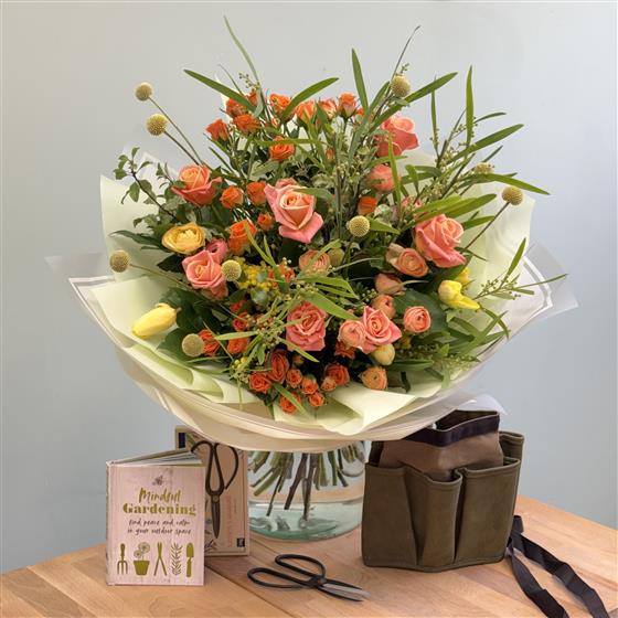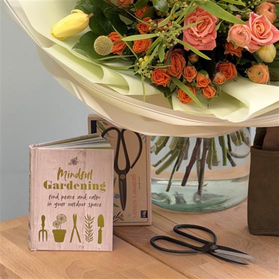 This perfect gift bundle includes an artisan bouquet, gardening inspiration book, utility belt and scissors.