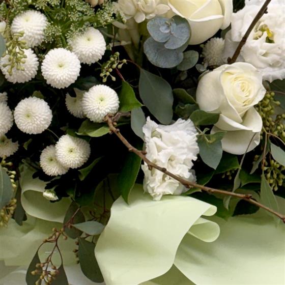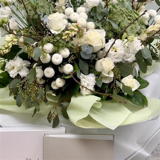 At the heart of this giftset is our White Purity bouquet, a masterclass in texture and tone. Our expert florists hand-craft each arrangement using premium white roses, ruffled white Lisianthus, and playful button chrysanthemums, all set against the refreshing scent of eucalyptus. During the spring season, we include crisp white tulips to celebrate the magic of new life. The design is finished with elegant twigs that dance like the wind, adding a unique, artistic movement to this stunning all-white display.