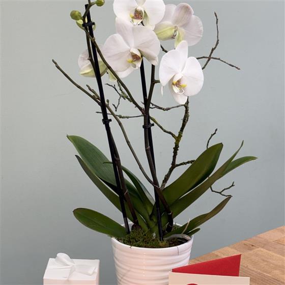 The Orchid Opulence Giftset, a sophisticated and long-lasting alternative to a traditional bouquet from Lily’s Flowers, Lightwater. At the heart of this elegant bundle is a stunning double-stemmed Phalaenopsis Orchid, chosen for its graceful, architectural beauty and enduring blooms. Presented in a premium ceramic pot, this living piece of art is designed to bring a touch of luxury to any interior for weeks to come.