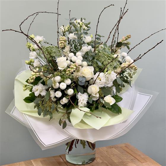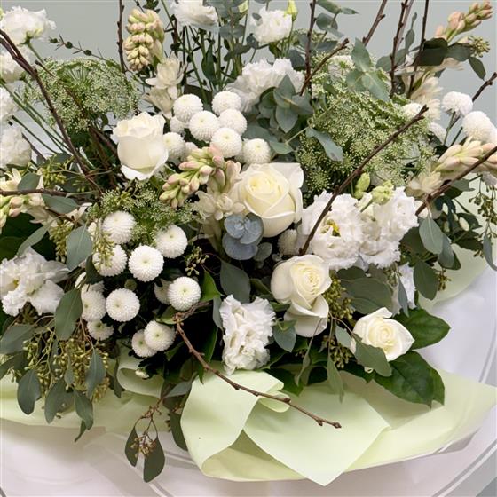 Our expert florists hand-craft each bouquet using premium white roses and ruffled white Lisianthus, accented by playful button chrysanthemums and the refreshing scent of eucalyptus. During the season, we include crisp spring white tulips to celebrate the changing year. The design is finished with elegant twigs that dance like the wind, adding a unique, artistic movement to the arrangement.
