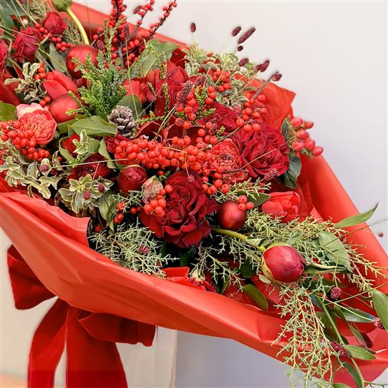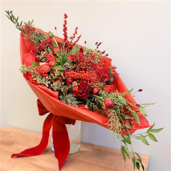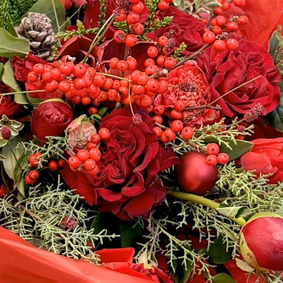 Expertly crafted by our senior designers at Lily's Flowers, this arrangement features a rich tapestry of premium red blooms. Every flower is chosen for its texture, hue and longevity. To add that signature winter touch, we’ve woven in an abundance of glossy red Ilex berries and architectural evergreen foliage, creating a design that is as textured as it is beautiful.