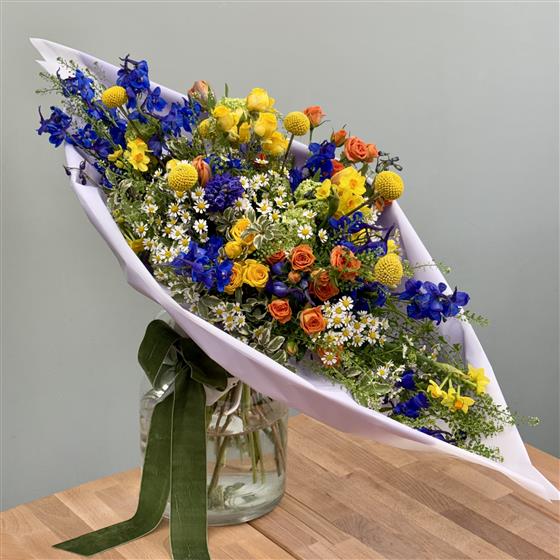 Because we work with the freshest daily deliveries, the specific varieties may evolve as we move through the season, but the vibrant spring palette and luxurious feel will always remain the focal point. To ensure the experience begins the moment it arrives, the Spring Ellipse is wrapped in a signature, "Instagrammable" style, making it perfectly staged for its very own photoshoot before it takes pride of place in your home. Experience the pinnacle of Surrey floral design with this showstopping, trend-led arrangement.