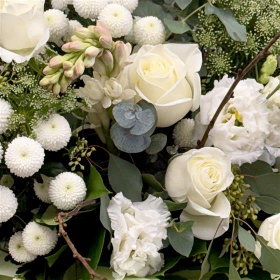 Our expert florists hand-craft each bouquet using premium white roses and ruffled white Lisianthus, accented by playful button chrysanthemums and the refreshing scent of eucalyptus. During the season, we include crisp spring white tulips to celebrate the changing year. The design is finished with elegant twigs that dance like the wind, adding a unique, artistic movement to the arrangement.