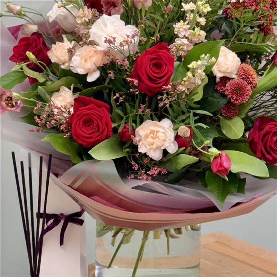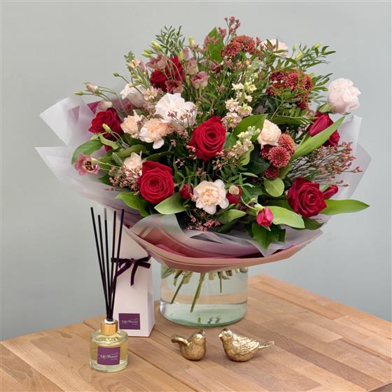 This gift bundle includes a handtied bouquet, 2 golden bird ornaments and a reed diffuser.