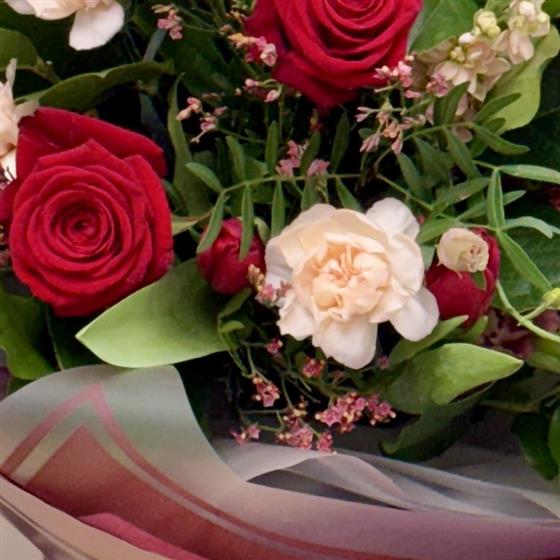An enchanting spring bouquet features a captivating blend of red tulips, delicate roses, and romantic spray roses. A perfect expression of love and affection for that special someone.
