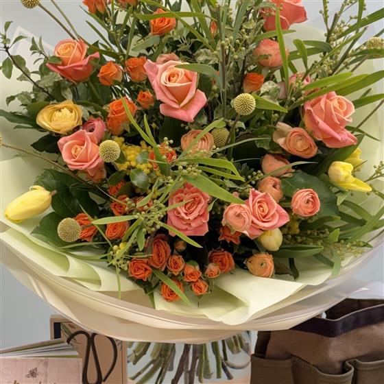 This delightful handtied bouquet features tones of Peach, Pink, orange & lemon. We have created this bouquet of roses, spray roses, tulips and elegant soft foliages to create a timeless classic full of elegant colours, textures and playfulness.