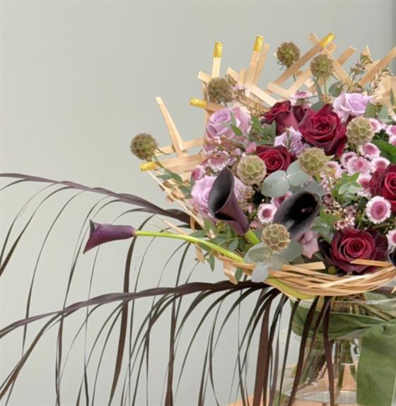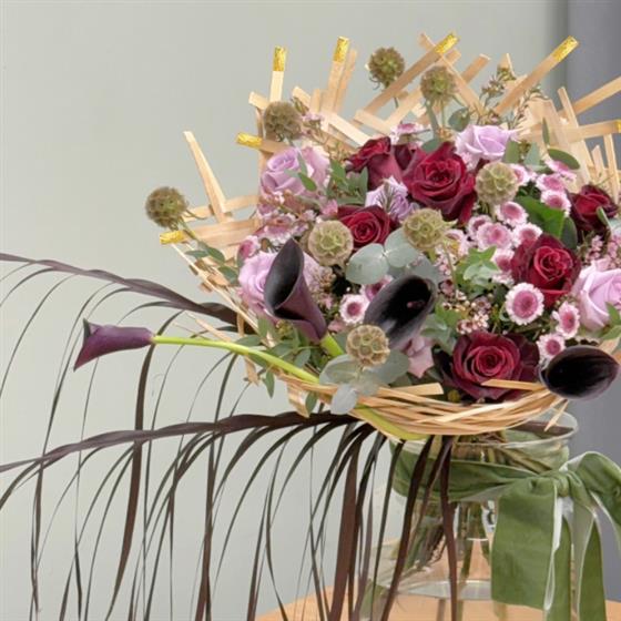 Each arrangement is built upon a bespoke, hand-crafted frame composed of delicate wooden strips. To add a touch of extra luxury, select ends of the wooden frame have been meticulously sprayed in gold paint, catching the light. Woven through this architectural skeleton is a selection of luxurious, rich florals, chosen for their deep pigments and intricate textures to create a dense, tapestry-like display.
