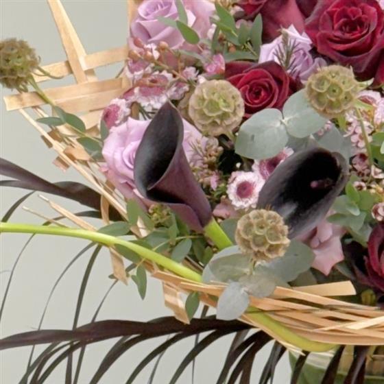 The true "couture" finish of this design lies in the deep burgundy-black tie leaves. Our artisan florists have hand-stripped each leaf to create a soft, feathered texture, providing a sophisticated and dramatic flourish.