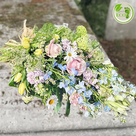 Our Traditional Tied Sheaf is the epitome of simple, natural elegance. This eco-friendly floral tribute is handcrafted in Lightwater using only the flower stems themselves, bound together in the time-honoured traditional way. We avoid all plastics and floral foams, finishing the arrangement with natural garden twine and sustainably sourced raffia for a rustic, sophisticated aesthetic that is entirely biodegradable.