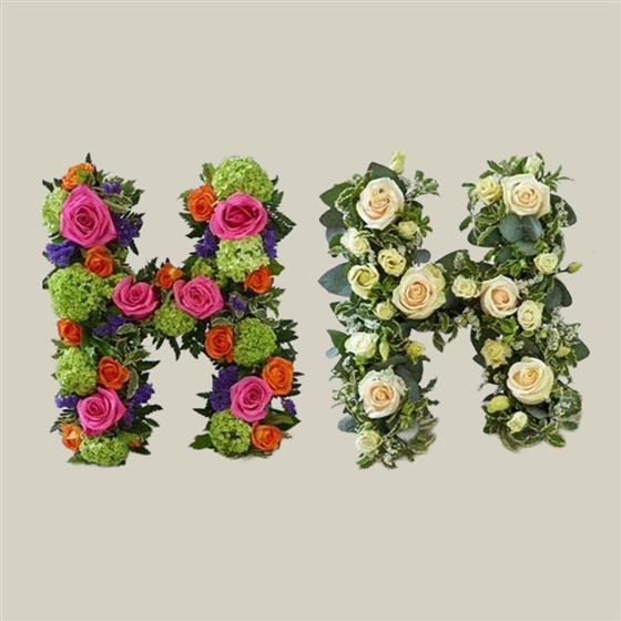 Based tribute letter using mixed delicate flowers and foliages. Simply insert the word or name in the box below, no longer than 8 characters, then choose your preferred colour mix for each letter using the drop-down menu. Our florists will create your bespoke wording perfectly, just the way you desire.